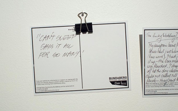 “Everyone has an experience of the floods and tornados – whether it be as an observer from afar, a flood affected resident or someone who is still rebuilding both physically and emotionally today and I’m honoured to think this exhibition is assisting some with their recovery process.”[v]