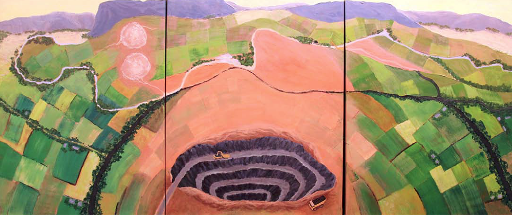 Phil Bazzo’s painting, Miles: At the Crossroads (Triptych, 2008) presented two concepts: the physical nature of the intersections of roads in Miles including the dynamics of heavy road vehicles and the metaphor of crossroads to infer change and concerns for the future. Both found natural and manmade objects and materials were also utilized as the visual language of protest. This was evident in the mixed media works of Jennifer Wright (Summers): Searching for Life in the Anthropocene 1 (2014), using tea bags, feathers, fabric pen & ink, watercolour and Anthropocene Nest (2014), that was made from plastic bags and pelican bone. Nicki Laws’ Habitat Gone (2014) collaged and embroidered the materials found in the fluoro safety barriers widely used in the industries found in the region.